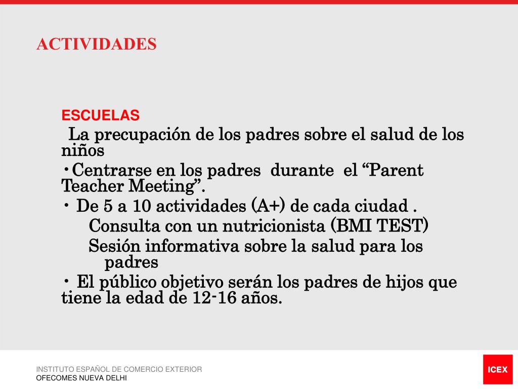 ACTIVIDADES • ESCUELAS • La precupación de los padres sobre el salud de los niños • Centrarse en los padres durante el “Parent Teacher Meeting”. • De 5 a 10 actividades (A+) de cada ciudad . Consulta con un nutricionista (BMI TEST) Sesión informativa sobre la salud para los padres • El público objetivo serán los padres de hijos que tiene la edad de 12-16 años. INSTITUTO ESPAÑOL DE COMERCIO EXTERIOR OFECOMES NUEVA DELHI