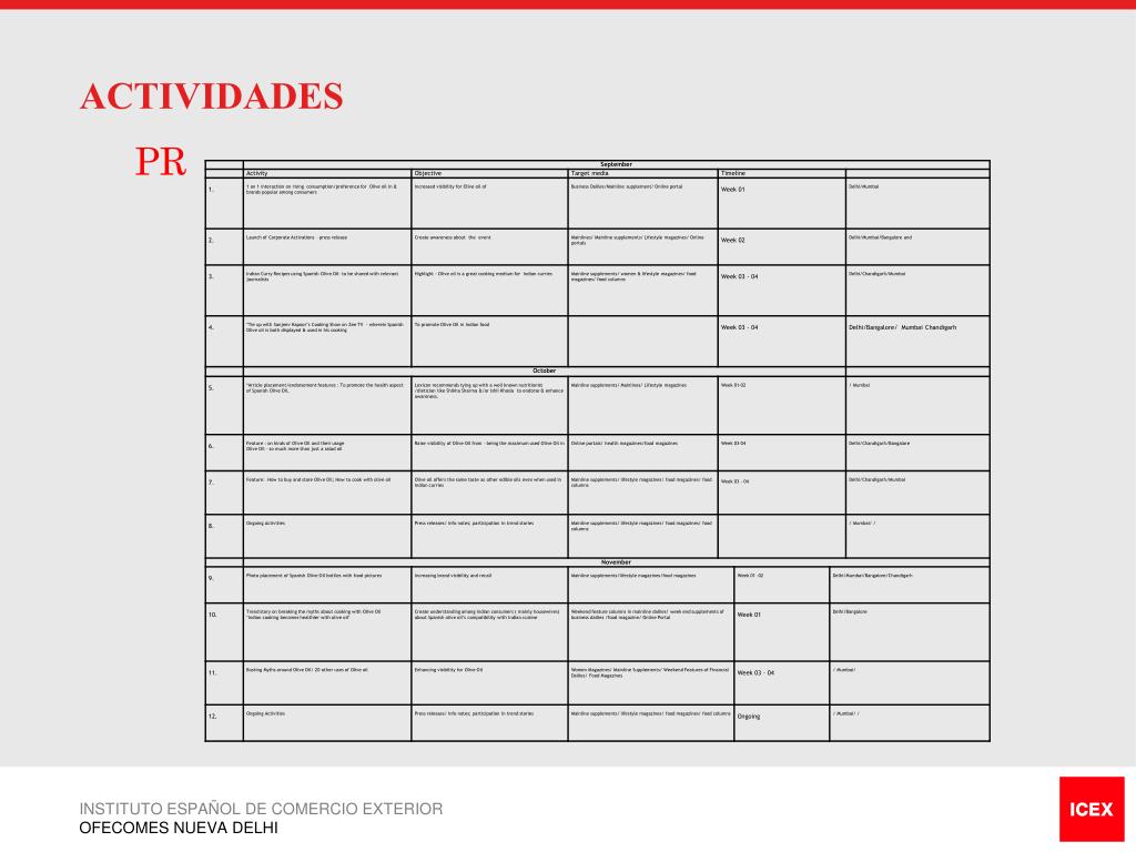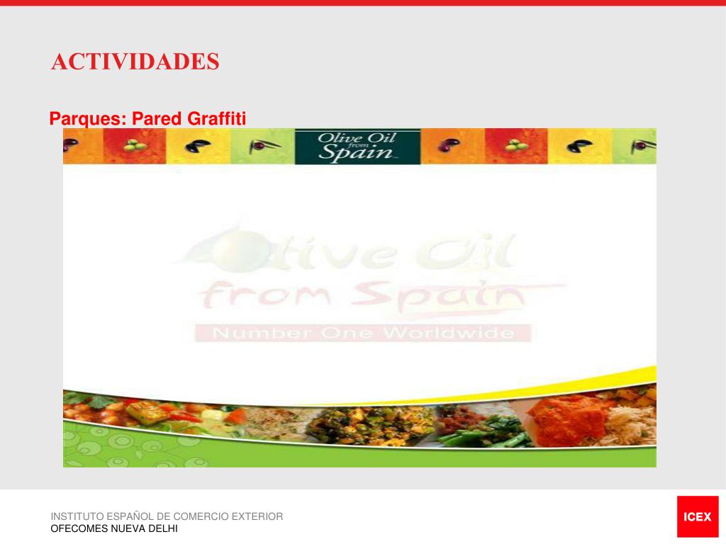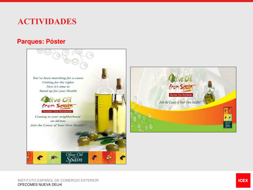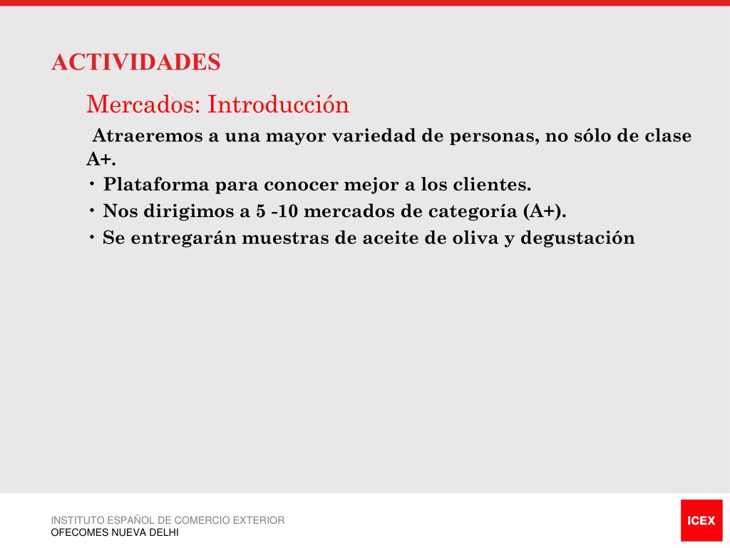 ACTIVIDADES • Mercados: Introducción • Atraeremos a una mayor variedad de personas, no sólo de clase A+. • Plataforma para conocer mejor a los clientes. • Nos dirigimos a 5 -10 mercados de categoría (A+). • Se entregarán muestras de aceite de oliva y degustación INSTITUTO ESPAÑOL DE COMERCIO EXTERIOR OFECOMES NUEVA DELHI