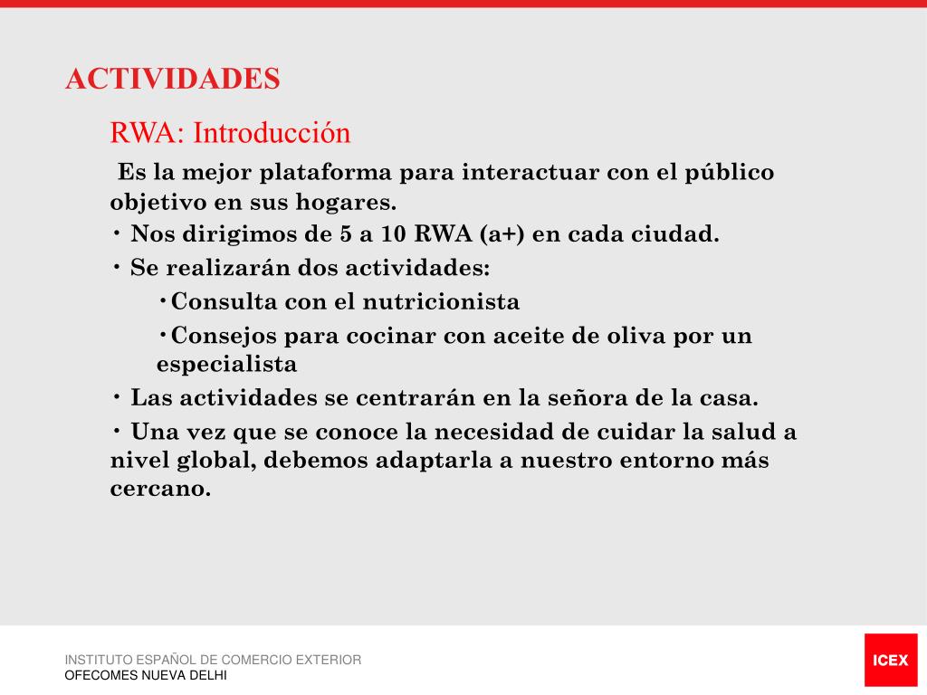 ACTIVIDADES • RWA: Introducción • Es la mejor plataforma para interactuar con el público objetivo en sus hogares. • Nos dirigimos de 5 a 10 RWA (a+) en cada ciudad. • Se realizarán dos actividades: • Consulta con el nutricionista • Consejos para cocinar con aceite de oliva por un especialista • Las actividades se centrarán en la señora de la casa. • Una vez que se conoce la necesidad de cuidar la salud a nivel global, debemos adaptarla a nuestro entorno más cercano. INSTITUTO ESPAÑOL DE COMERCIO EXTERIOR OFECOMES NUEVA DELHI