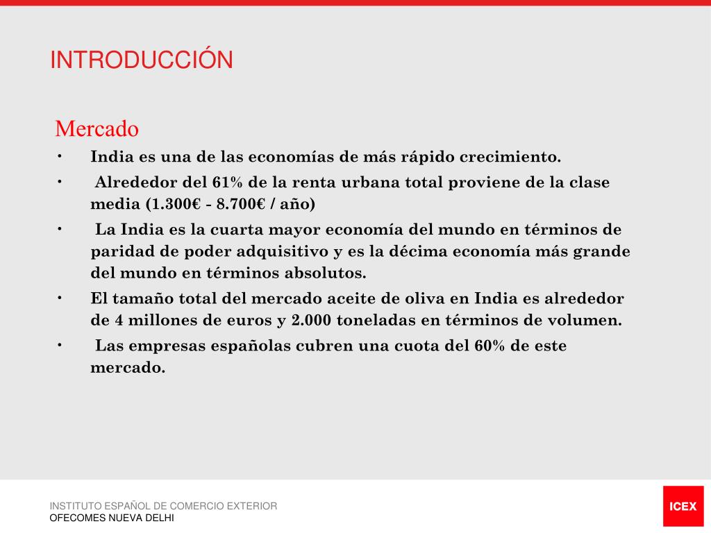 INTRODUCCIÓN • Mercado • India es una de las economías de más rápido crecimiento. • Alrededor del 61% de la renta urbana total proviene de la clase media (1.300€ - 8.700€ / año) • La India es la cuarta mayor economía del mundo en términos de paridad de poder adquisitivo y es la décima economía más grande del mundo en términos absolutos. • El tamaño total del mercado aceite de oliva en India es alrededor de 4 millones de euros y 2.000 toneladas en términos de volumen. • Las empresas españolas cubren una cuota del 60% de este mercado. INSTITUTO ESPAÑOL DE COMERCIO EXTERIOR OFECOMES NUEVA DELHI