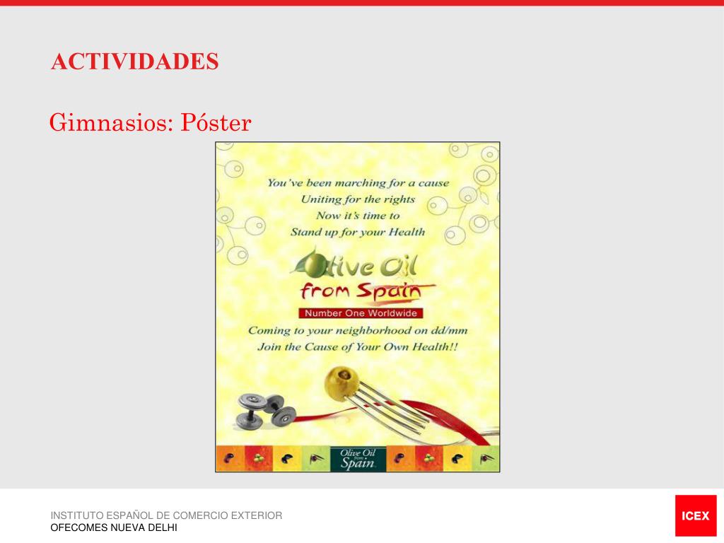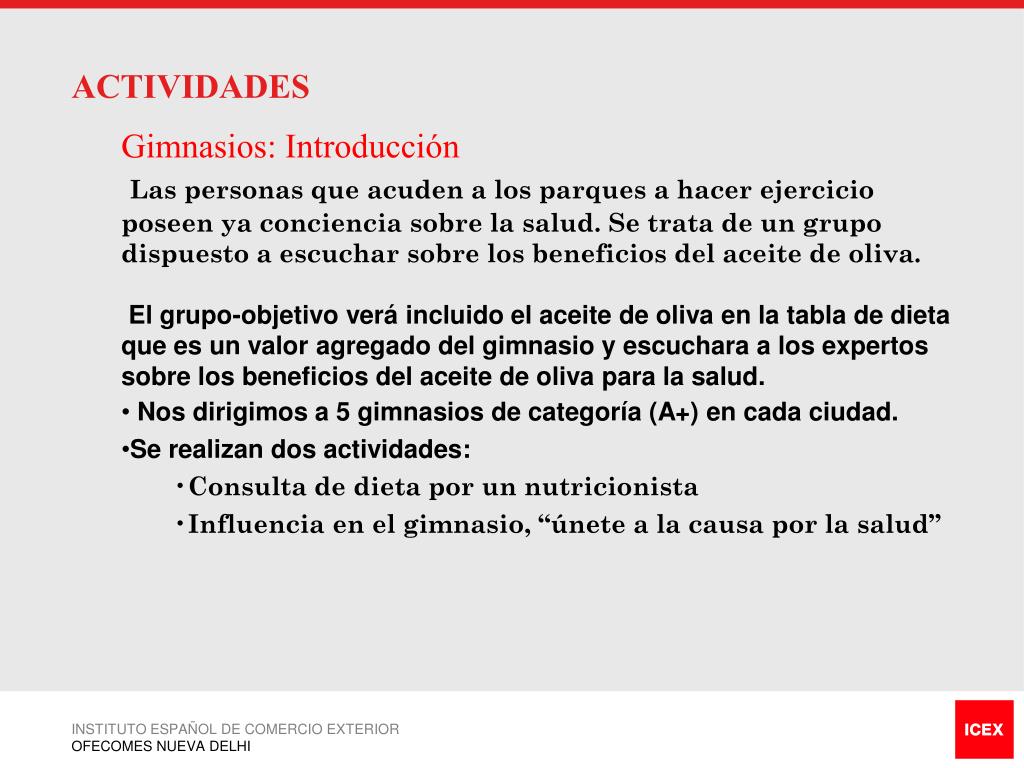 ACTIVIDADES • Gimnasios: Introducción • Las personas que acuden a los parques a hacer ejercicio poseen ya conciencia sobre la salud. Se trata de un grupo dispuesto a escuchar sobre los beneficios del aceite de oliva. • El grupo-objetivo verá incluido el aceite de oliva en la tabla de dieta que es un valor agregado del gimnasio y escuchara a los expertos sobre los beneficios del aceite de oliva para la salud. • Nos dirigimos a 5 gimnasios de categoría (A+) en cada ciudad. • Se realizan dos actividades: • Consulta de dieta por un nutricionista • Influencia en el gimnasio, “únete a la causa por la salud” INSTITUTO ESPAÑOL DE COMERCIO EXTERIOR OFECOMES NUEVA DELHI