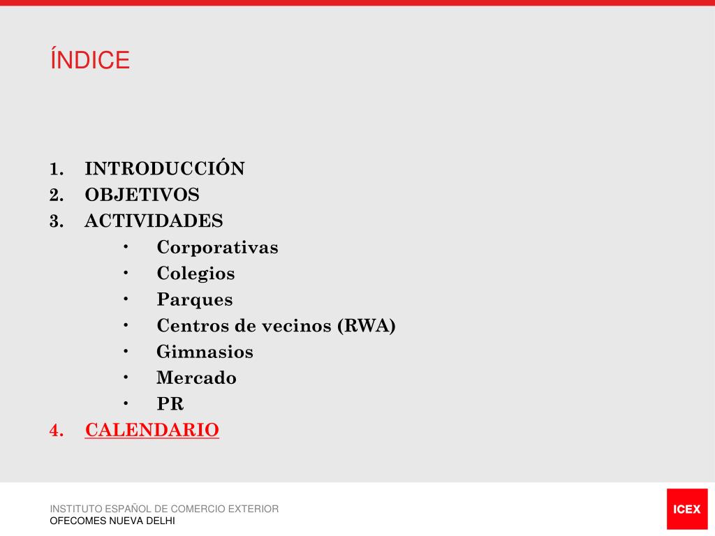 ÍNDICE • INTRODUCCIÓN • OBJETIVOS • ACTIVIDADES • Corporativas • Colegios • Parques • Centros de vecinos (RWA) • Gimnasios • Mercado • PR • CALENDARIO INSTITUTO ESPAÑOL DE COMERCIO EXTERIOR OFECOMES NUEVA DELHI
