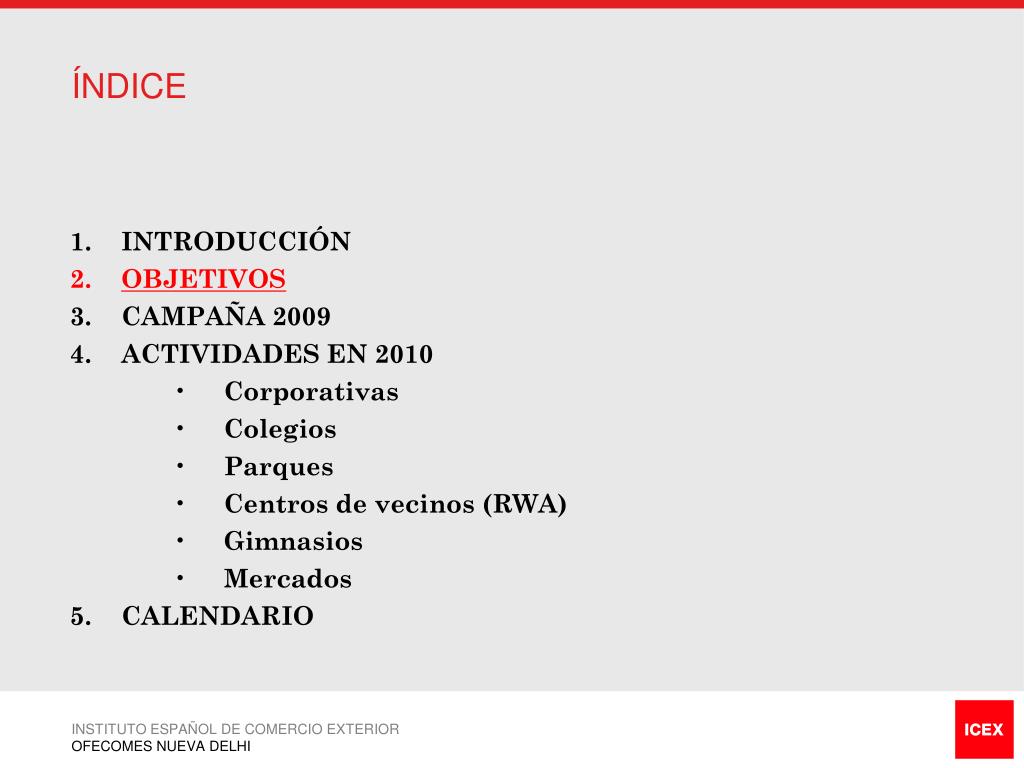 1 ÍNDICE • 1. INTRODUCCIÓN • 2. OBJETIVOS • CAMPAÑA 2009 • ACTIVIDADES EN 2010 • Corporativas • Colegios • Parques • Centros de vecinos (RWA) • Gimnasios • Mercados • PR • 4. CALENDARIO INSTITUTO ESPAÑOL DE COMERCIO EXTERIOR OFECOMES NUEVA DELHI