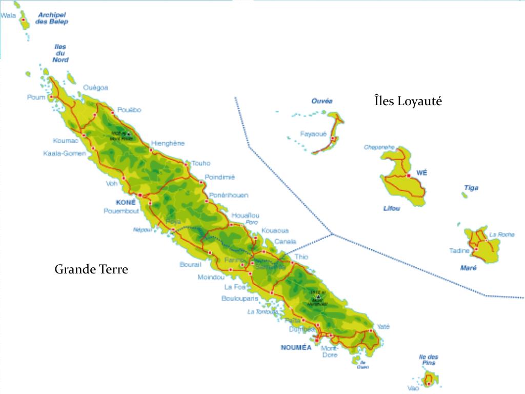 La Nouvelle-Calédonie. Une localisation dans le Pacifique Sud entre l’Asie et l’Amérique. Le monde centré sur le Pacifique. 18 000 km. Nouvelle-Calédonie. Un pays composé d’une grande terre et de plusieurs îles. Îles Loyauté. Grande Terre. Une richesse : le nickel.