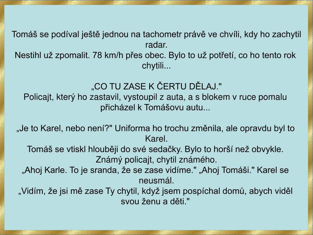 Tomáš se podíval ještě jednou na tachometr právě ve chvíli, kdy ho zachytilradar.Nestihl už zpomalit. 78 km/h přes obec. Bylo to už potřetí, co ho tento rok chytili...„CO TU ZASE K ČERTU DĚLAJ."Policajt, který ho zastavil, vystoupil z auta, a s blokem v ruce pomalu přicházel k Tomášovu autu... „Je to Karel, nebo není?" Uniforma ho trochu změnila, ale opravdu byl to Karel.Tomáš se vtiskl hlouběji do své sedačky. Bylo to horší než obvykle. Známý policajt, chytil známého.„Ahoj Karle. To je sranda, že se zase vidíme." „Ahoj Tomáši." Karel se neusmál.„Vidím, že jsi mě zase Ty chytil, když jsem pospíchal domů, abych viděl svou ženu a děti."