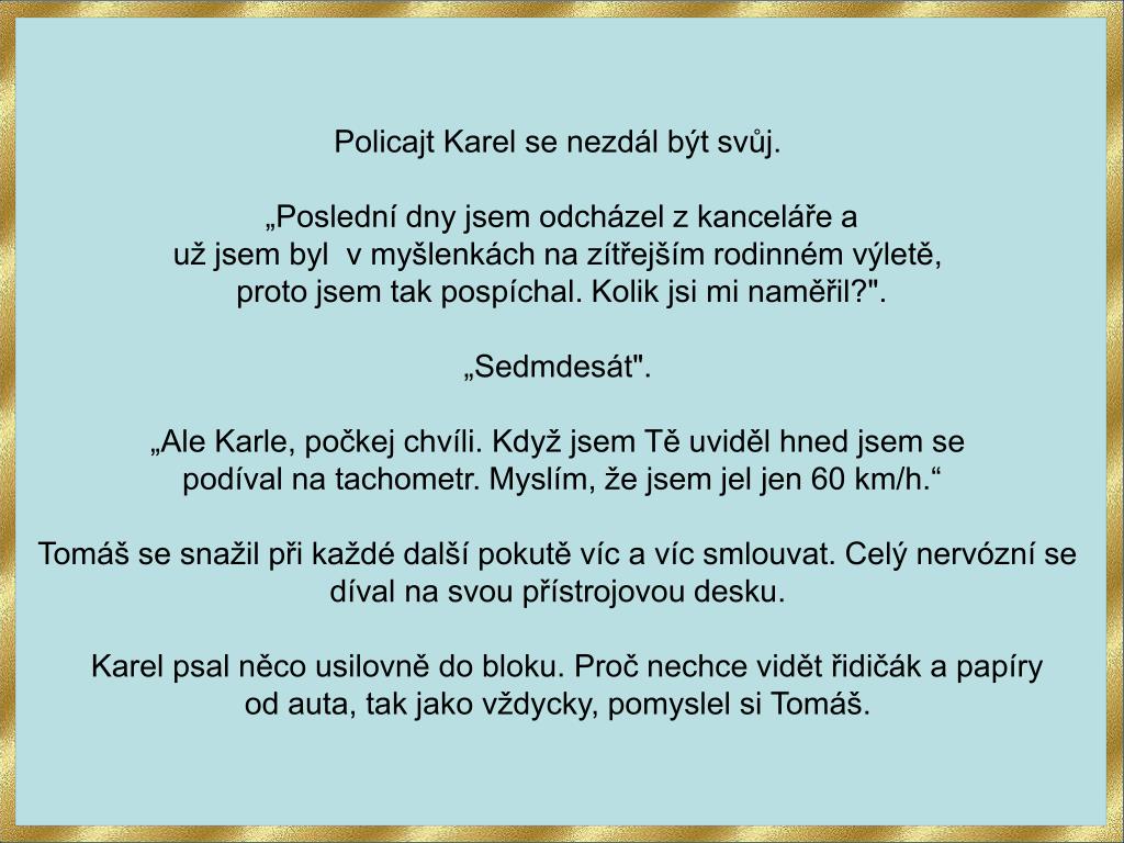 Policajt Karel se nezdál být svůj. „Poslední dny jsem odcházel z kanceláře auž jsem byl v myšlenkách na zítřejším rodinném výletě, proto jsem tak pospíchal. Kolik jsi mi naměřil?". „Sedmdesát". „Ale Karle, počkej chvíli. Když jsem Tě uviděl hned jsem se podíval na tachometr. Myslím, že jsem jel jen 60 km/h.“ Tomáš se snažil při každé další pokutě víc a víc smlouvat. Celý nervózní se díval na svou přístrojovou desku. Karel psal něco usilovně do bloku. Proč nechce vidět řidičák a papíryod auta, tak jako vždycky, pomyslel si Tomáš.