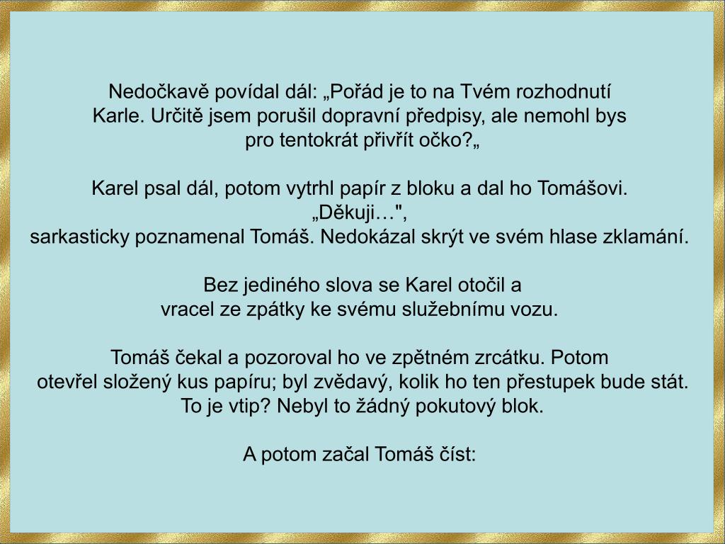 Nedočkavě povídal dál: „Pořád je to na Tvém rozhodnutí Karle. Určitě jsem porušil dopravní předpisy, ale nemohl bys pro tentokrát přivřít očko?„ Karel psal dál, potom vytrhl papír z bloku a dal ho Tomášovi. „Děkuji…", sarkasticky poznamenal Tomáš. Nedokázal skrýt ve svém hlase zklamání. Bez jediného slova se Karel otočil avracel ze zpátky ke svému služebnímu vozu. Tomáš čekal a pozoroval ho ve zpětném zrcátku. Potom otevřel složený kus papíru; byl zvědavý, kolik ho ten přestupek bude stát.To je vtip? Nebyl to žádný pokutový blok. A potom začal Tomáš číst: