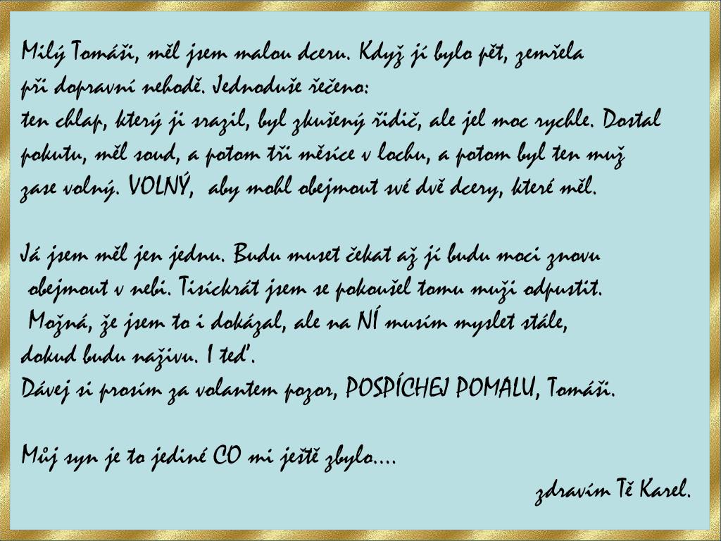 Milý Tomáši, měl jsem malou dceru. Když jí bylo pět, zemřela při dopravní nehodě. Jednoduše řečeno: ten chlap, který ji srazil, byl zkušený řidič, ale jel moc rychle. Dostal pokutu, měl soud, a potom tři měsíce v lochu, a potom byl ten muž zase volný. VOLNÝ, aby mohl obejmout své dvě dcery, které měl. Já jsem měl jen jednu. Budu muset čekat až jí budu moci znovu obejmout v nebi. Tisíckrát jsem se pokoušel tomu muži odpustit. Možná, že jsem to i dokázal, ale na NÍ musím myslet stále, dokud budu naživu. I teď. Dávej si prosím za volantem pozor, POSPÍCHEJ POMALU, Tomáši. Můj syn je to jediné CO mi ještě zbylo.... zdravím Tě Karel.