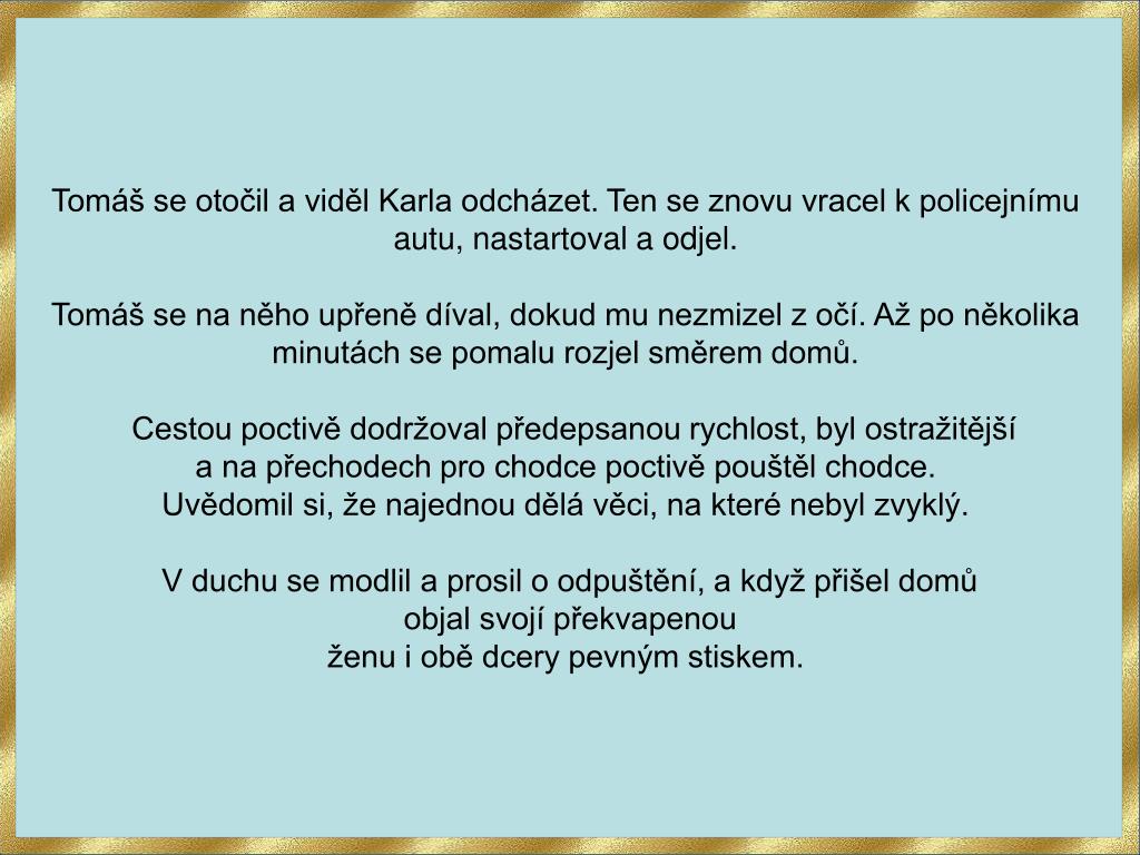 Tomáš se otočil a viděl Karla odcházet. Ten se znovu vracel k policejnímu autu, nastartoval a odjel. Tomáš se na něho upřeně díval, dokud mu nezmizel z očí. Až po několika minutách se pomalu rozjel směrem domů. Cestou poctivě dodržoval předepsanou rychlost, byl ostražitějšía na přechodech pro chodce poctivě pouštěl chodce. Uvědomil si, že najednou dělá věci, na které nebyl zvyklý. V duchu se modlil a prosil o odpuštění, a když přišel domů objal svojí překvapenou ženu i obě dcery pevným stiskem.
