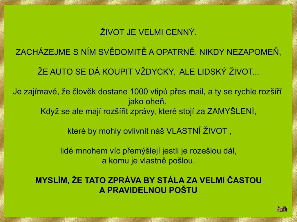 ŽIVOT JE VELMI CENNÝ. ZACHÁZEJME S NÍM SVĚDOMITĚ A OPATRNĚ. NIKDY NEZAPOMEŇ, ŽE AUTO SE DÁ KOUPIT VŽDYCKY, ALE LIDSKÝ ŽIVOT... Je zajímavé, že člověk dostane 1000 vtipů přes mail, a ty se rychle rozšíří jako oheň. Když se ale mají rozšířit zprávy, které stojí za ZAMYŠLENÍ, které by mohly ovlivnit náš VLASTNÍ ŽIVOT , lidé mnohem víc přemýšlejí jestli je rozešlou dál, a komu je vlastně pošlou. MYSLÍM, ŽE TATO ZPRÁVA BY STÁLA ZA VELMI ČASTOU A PRAVIDELNOU POŠTU kovik