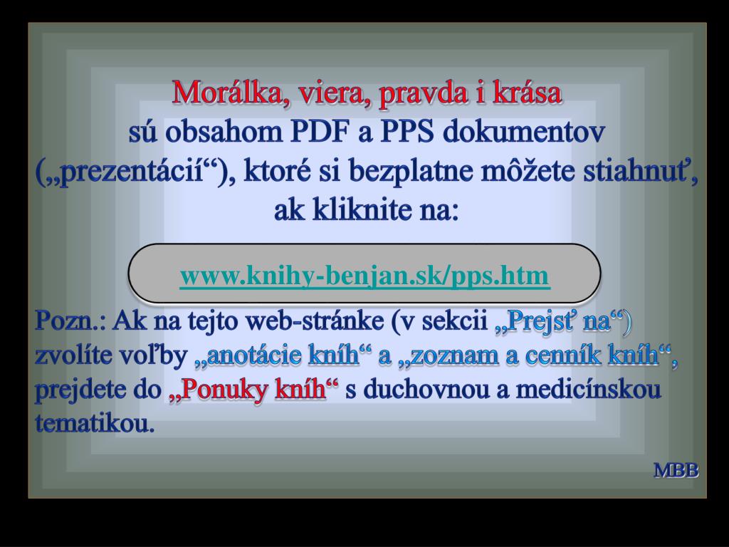 Morálka, viera, pravda i krása sú obsahom PDF a PPS dokumentov („prezentácií“), ktoré si bezplatne môžete stiahnuť, ak kliknite na: Pozn.: Ak na tejto web-stránke (v sekcii „Prejsť na“) zvolíte voľby „anotácie kníh“ a „zoznam a cenník kníh“, prejdete do „Ponuky kníh“ s duchovnou a medicínskou tematikou. MBB www.knihy-benjan.sk/pps.htm