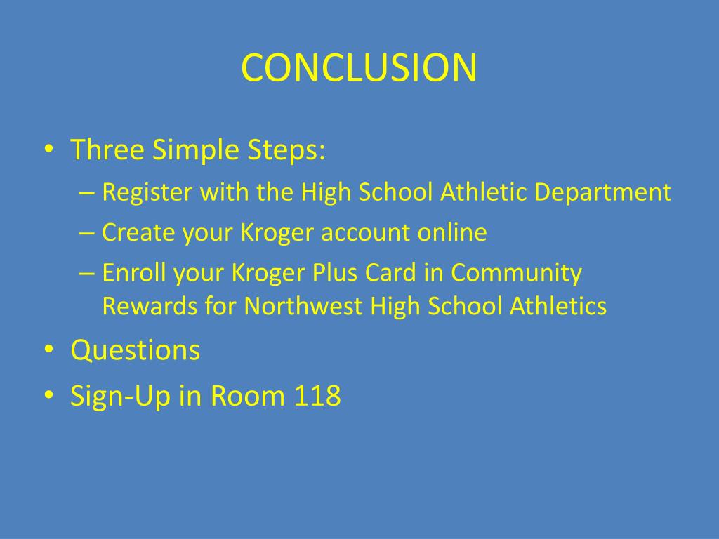 CONCLUSION • Three Simple Steps: • Register with the High School Athletic Department • Create your Kroger account online • Enroll your Kroger Plus Card in Community Rewards for Northwest High School Athletics • Questions • Sign-Up in Room 118