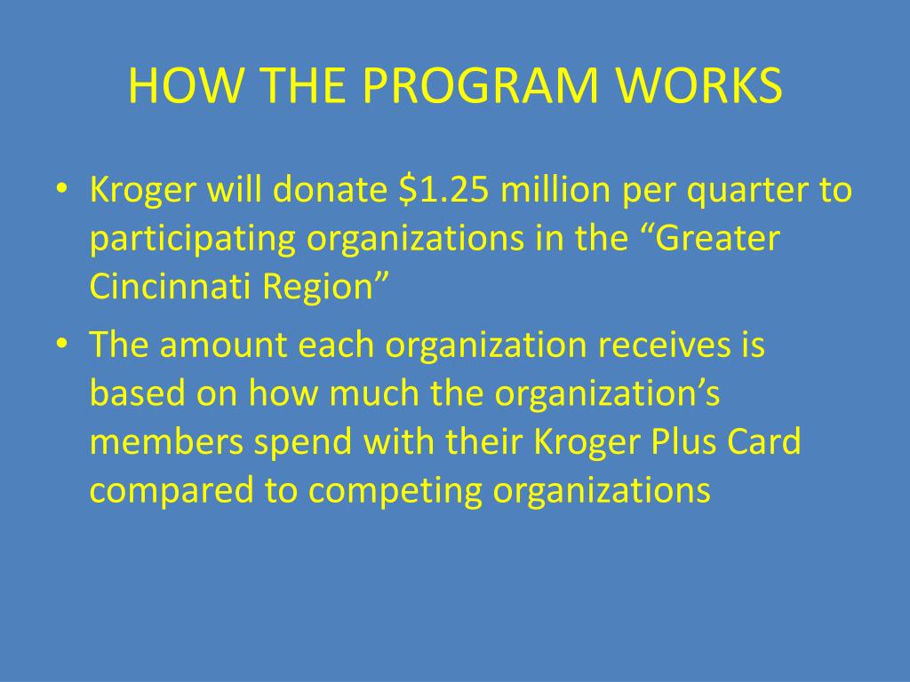 HOW THE PROGRAM WORKS • Kroger will donate $1.25 million per quarter to participating organizations in the “Greater Cincinnati Region” • The amount each organization receives is based on how much the organization’s members spend with their Kroger Plus Card compared to competing organizations