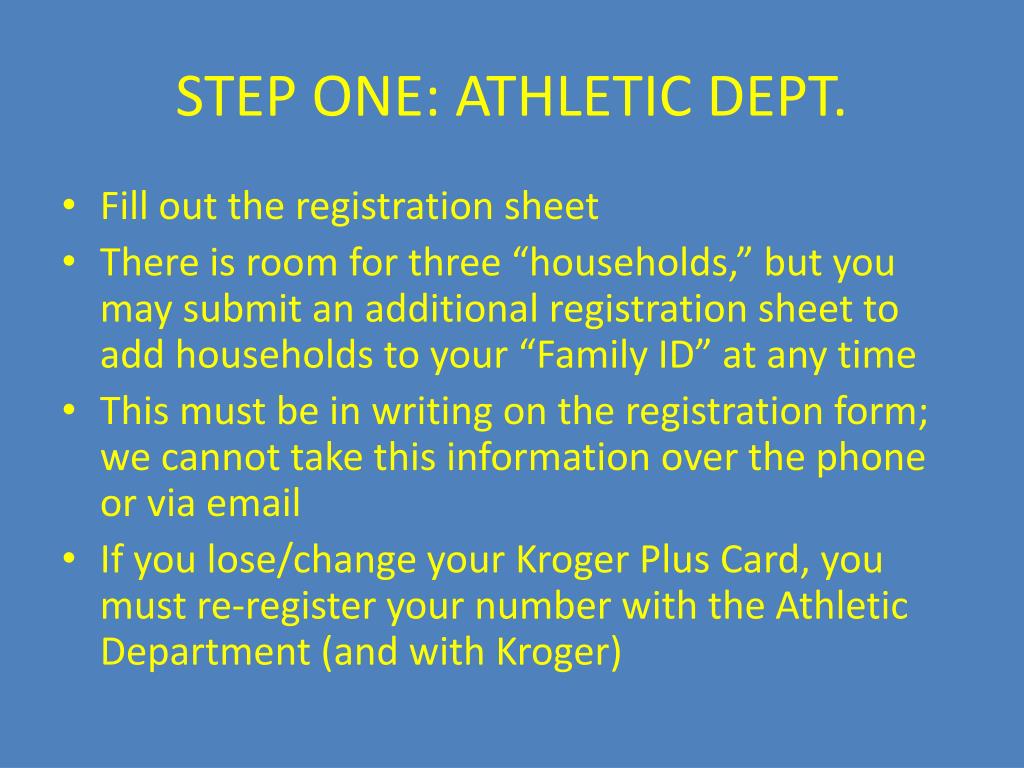 STEP ONE: ATHLETIC DEPT. • Fill out the registration sheet • There is room for three “households,” but you may submit an additional registration sheet to add households to your “Family ID” at any time • This must be in writing on the registration form; we cannot take this information over the phone or via email • If you lose/change your Kroger Plus Card, you must re-register your number with the Athletic Department (and with Kroger)