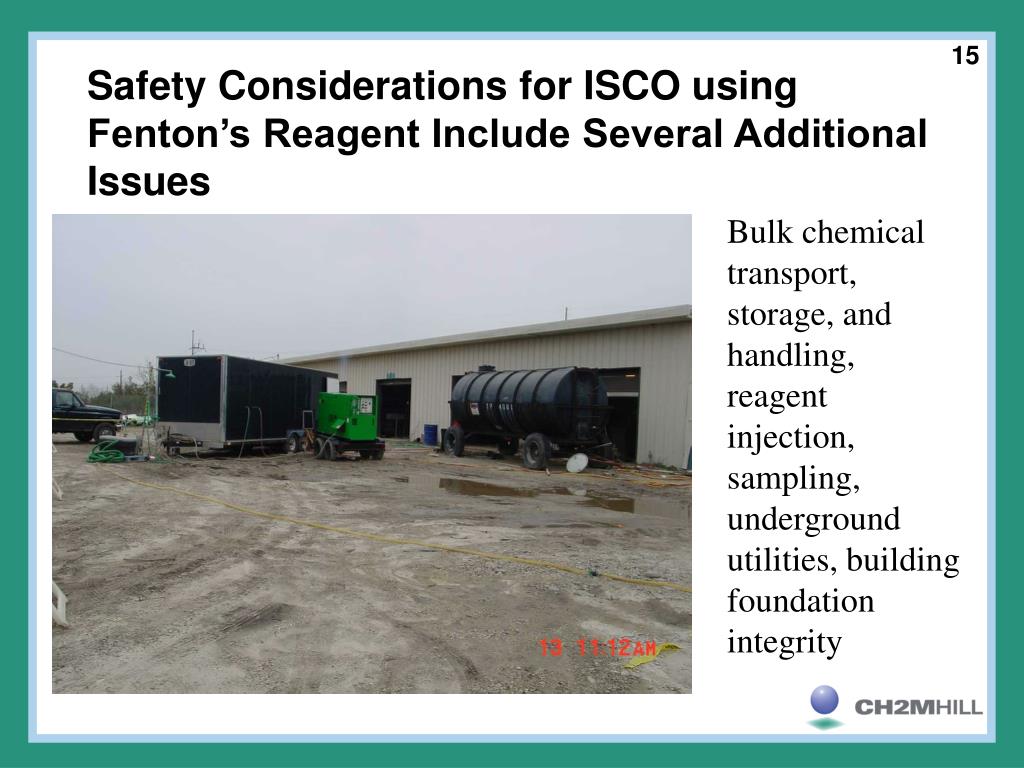 Safety Considerations for ISCO using Fenton’s Reagent Include Several Additional Issues Bulk chemical transport, storage, and handling, reagent injection, sampling, underground utilities, building foundation integrity