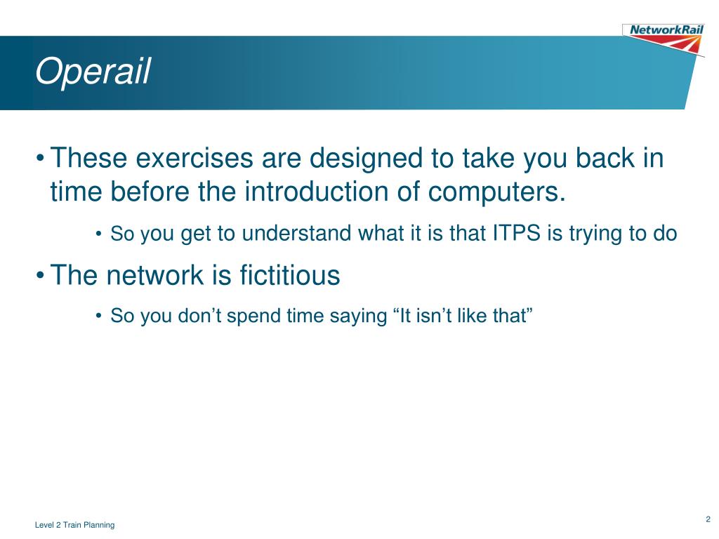RAILWAY INDUSTRY TRAIN PLANNING LEVEL 2 TRAINING. Module 6 – Practical Exercise. Operail. These exercises are designed to take you back in time before the introduction of computers. So y ou get to understand what it is that ITPS is trying to do The network is fictitious