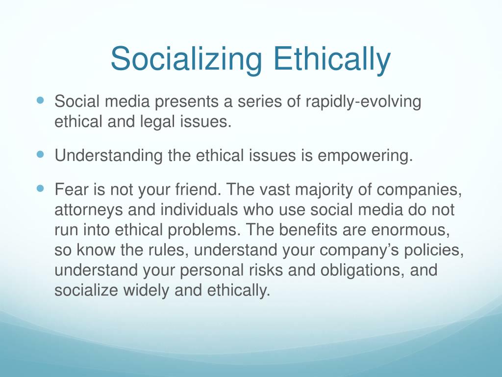 Socializing Ethically • Social media presents a series of rapidly-evolving ethical and legal issues. • Understanding the ethical issues is empowering. • Fear is not your friend. The vast majority of companies, attorneys and individuals who use social media do not run into ethical problems. The benefits are enormous, so know the rules, understand your company’s policies, understand your personal risks and obligations, and socialize widely and ethically.