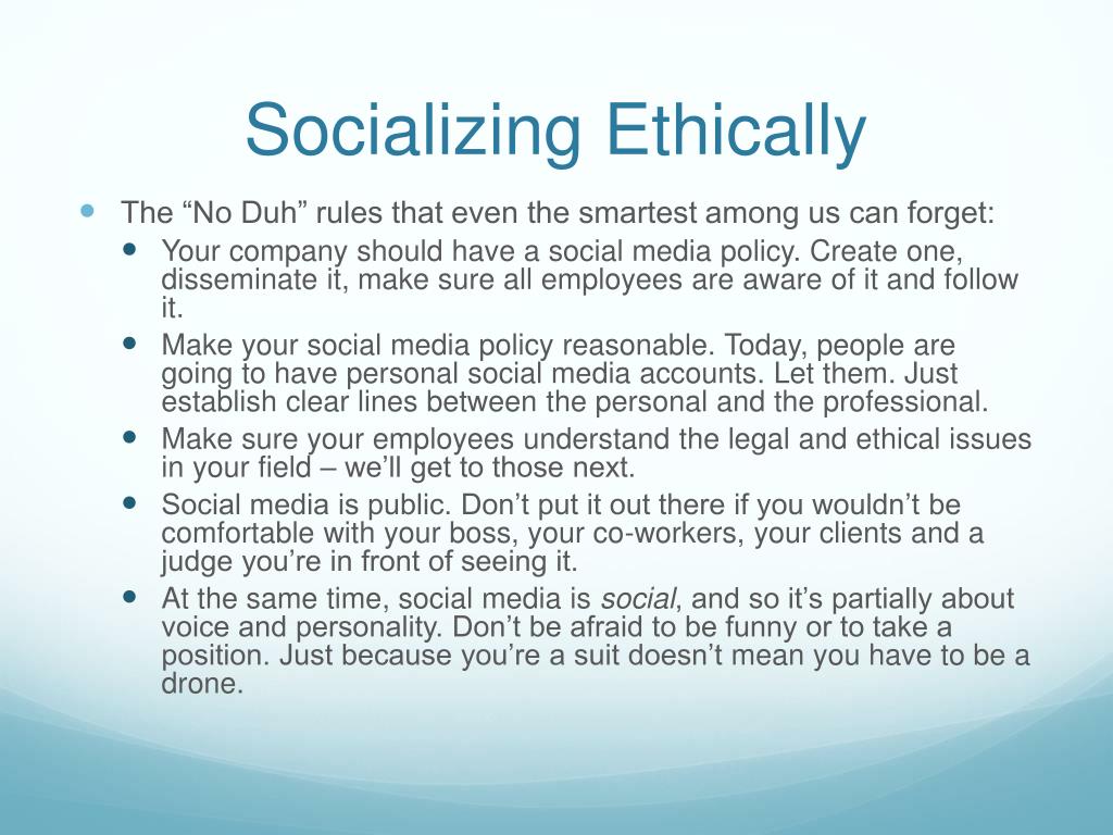 Socializing Ethically • The “No Duh” rules that even the smartest among us can forget: • Your company should have a social media policy. Create one, disseminate it, make sure all employees are aware of it and follow it. • Make your social media policy reasonable. Today, people are going to have personal social media accounts. Let them. Just establish clear lines between the personal and the professional. • Make sure your employees understand the legal and ethical issues in your field – we’ll get to those next. • Social media is public. Don’t put it out there if you wouldn’t be comfortable with your boss, your co-workers, your clients and a judge you’re in front of seeing it. • At the same time, social media is social, and so it’s partially about voice and personality. Don’t be afraid to be funny or to take a position. Just because you’re a suit doesn’t mean you have to be a drone.
