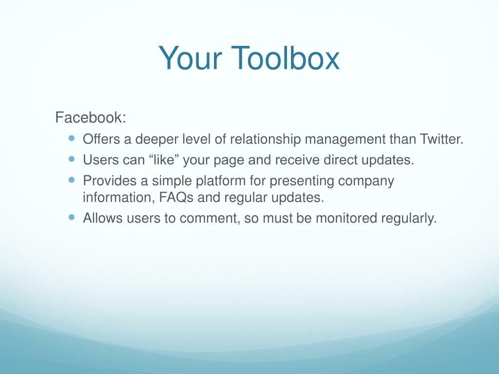 Your Toolbox Facebook: • Offers a deeper level of relationship management than Twitter. • Users can “like” your page and receive direct updates. • Provides a simple platform for presenting company information, FAQs and regular updates. • Allows users to comment, so must be monitored regularly.