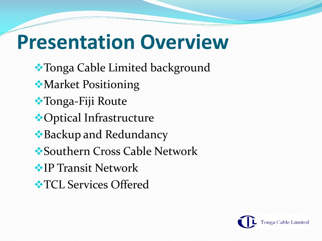 Presentation Overview • Tonga Cable Limited background • Market Positioning • Tonga-Fiji Route • Optical Infrastructure • Backup and Redundancy • Southern Cross Cable Network • IP Transit Network • TCL Services Offered
