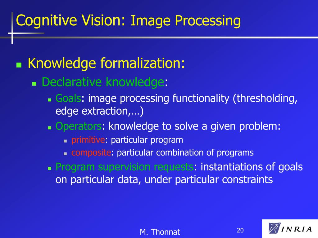 Cognitive Vision: Image Processing • Knowledge formalization: • Declarative knowledge: • Goals: image processing functionality (thresholding, edge extraction,…) • Operators: knowledge to solve a given problem: • primitive: particular program • composite: particular combination of programs • Program supervision requests: instantiations of goals on particular data, under particular constraints M. Thonnat