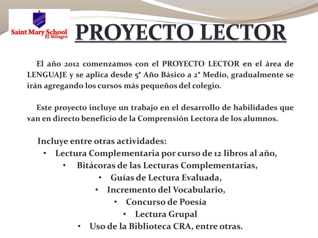 PROYECTO LECTOR • El año 2012 comenzamos con el PROYECTO LECTOR en el área de LENGUAJE y se aplica desde 5° Año Básico a 2° Medio, gradualmente se irán agregando los cursos más pequeños del colegio. • Este proyecto incluye un trabajo en el desarrollo de habilidades que van en directo beneficio de la Comprensión Lectora de los alumnos. • Incluye entre otras actividades: • Lectura Complementaria por curso de 12 libros al año, • Bitácoras de las Lecturas Complementarias, • Guías de Lectura Evaluada, • Incremento del Vocabulario, • Concurso de Poesía • Lectura Grupal • Uso de la Biblioteca CRA, entre otras.