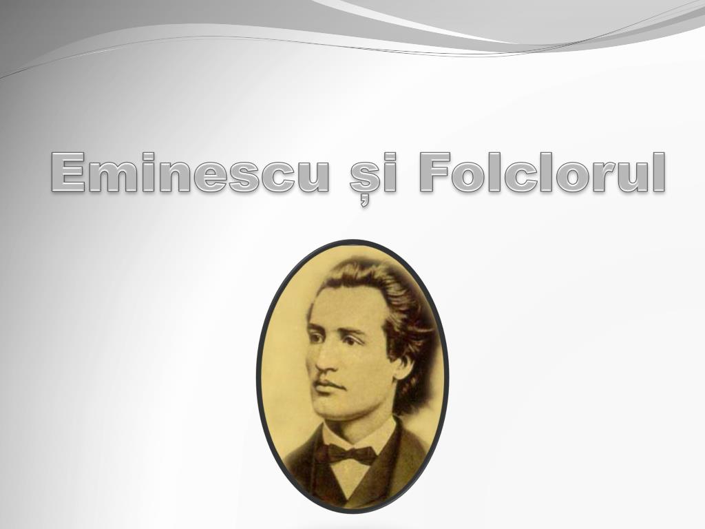 Eminescu și Folclorul Folclorul a fost întotdeauna pentru Eminescu un element fundamental în formarea si definirea personalității sale artistice. El a constituit în primul rând un izvor de inspirație atât tematic, cât si artistic. Eminescu a fost un culegător de folclor, dovadă a acestui lucru fiind manuscrisele lui în care s-a găsit un material folcloric bogat cuprinzând basme, proverbe, cântece epice și, mai ales, numeroase specii ale poeziei lirice.