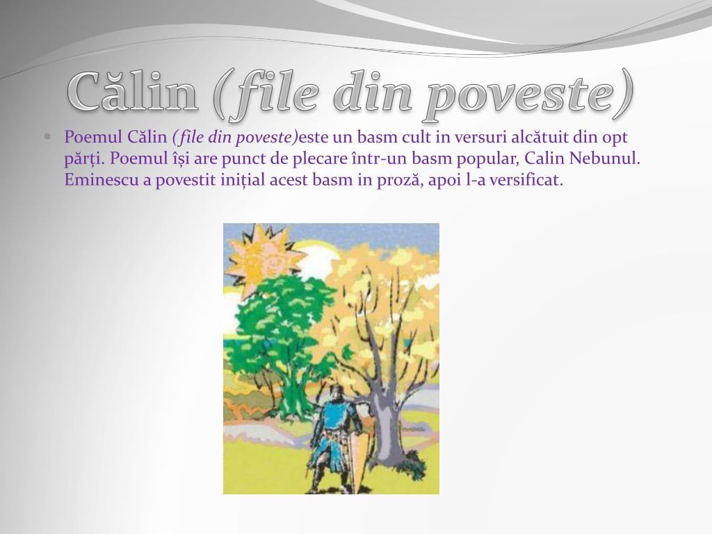 Călin (file din poveste) • Poemul Călin (file din poveste)este un basm cult in versuri alcătuit din opt părți. Poemul își are punct de plecare într-un basm popular, Calin Nebunul. Eminescu a povestit inițial acest basm in proză, apoi l-a versificat.