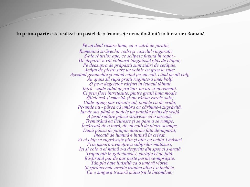 In prima parte este realizat un pastel de o frumusețe nemaiîntâlnită in literatura Romană. Peun deal răsare luna, ca o vatră de jăratic, Rumenind străvechii codri şi castelul singuraticŞ-ale râurilor ape, ce sclipesc fugind în ropot -De departe-n văi coboară tânguiosul glas de clopot;Pe deasupra de prăpăstii sunt zidiri de cetăţuie,Acăţat de pietre sure un voinic cu greu le suie;Aşezând genunchiu şi mână când pe-un colţ, când pe alt colţ,Au ajuns să rupă gratii ruginite-a unei bolţiŞi pe-a degetelor vârfuri în ietacul tăinuitIntră - unde zidul negru într-un arc a-ncremenit.Ci prin flori întreţesute, pintre gratii luna moaleSfiicioasă şi smerită şi-au vărsat razele sale;Unde-ajung par văruite zid, podele ca de cridă,Pe-unde nu - părea că umbra cu cărbune-i zugrăvită.Iar de sus până-n podele un painjăn prins de vrajăA ţesut subţire pânză străvezie ca o mreajă;Tremurând ea licureşte şi se pare a se rumpe,Încărcată de o bură, de un colb de pietre scumpe.După pânza de painjăn doarme fata de-mpărat;Înecată de lumină e întinsă în crivat.Al ei chip se zugrăveşte plin şi alb: cu ochiu-l măsuriPrin uşoara-nvineţire a subţirilor mătăsuri;Ici şi colo a ei haină s-a desprins din sponci ş-aratăTrupul alb în goliciunea-i, curăţia ei de fată.Răsfiratul păr de aur peste perini se-mprăştie,Tâmpla bate liniştită ca o umbră viorie,Şi sprâncenele arcate fruntea albă i-o încheie,Cu o singură trăsură măiestrit le încondeie;