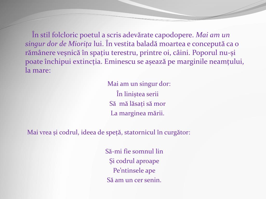În stil folcloric poetul a scris adevărate capodopere. Mai am un singur dor de Miorița lui. În vestita baladă moartea e concepută ca o rămânere veșnică în spațiu terestru, printre oi, câini. Poporul nu-și poate închipui extincția. Eminescu se așează pe marginile neamțului, la mare: Mai am un singur dor: În liniștea serii Să mă lăsați să mor La marginea mării. Mai vrea și codrul, ideea de speță, statornicul în curgător: Să-mi fie somnul lin Și codrul aproape Pe’ntinsele ape Să am un cer senin.