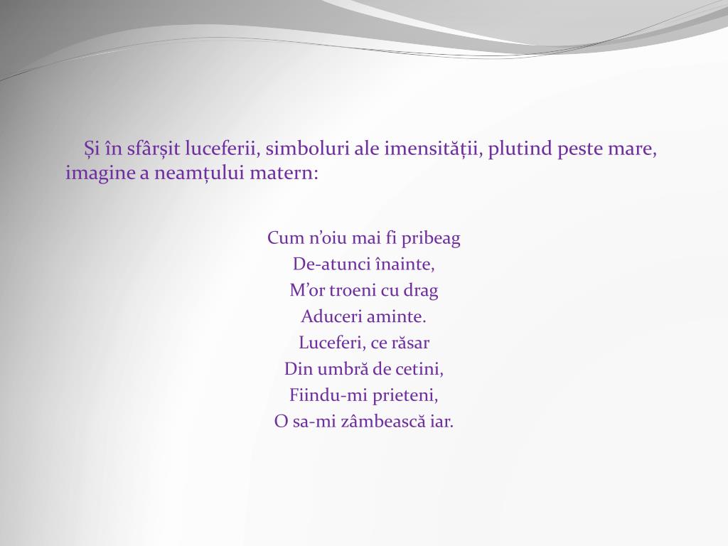 Și în sfârșit luceferii, simboluri ale imensității, plutind peste mare, imagine a neamțului matern: Cum n’oiu mai fi pribeag De-atunci înainte, M’ortroeni cu drag Aduceri aminte. Luceferi, ce răsar Din umbră de cetini, Fiindu-mi prieteni, O sa-mi zâmbească iar.