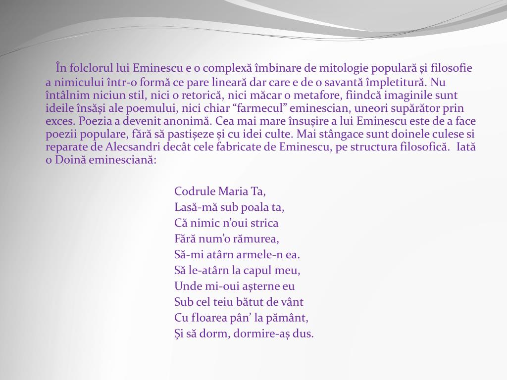 În folclorul lui Eminescu e o complexă îmbinare de mitologie populară și filosofie a nimicului într-o formă ce pare lineară dar care e de o savantă împletitură. Nu întâlnim niciun stil, nici o retorică, nici măcar o metafore, fiindcă imaginile sunt ideile însăși ale poemului, nici chiar “farmecul” eminescian, uneori supărător prin exces. Poezia a devenit anonimă. Cea mai mare însușire a lui Eminescu este de a face poezii populare, fără să pastișeze și cu idei culte. Mai stângace sunt doinele culese si reparate de Alecsandri decât cele fabricate de Eminescu, pe structura filosofică. Iată o Doină eminesciană: Codrule Maria Ta, Lasă-mă sub poala ta, Că nimic n’oui strica Fără num’o rămurea, Să-mi atârn armele-n ea. Să le-atârn la capul meu, Unde mi-oui așterne eu Sub cel teiu bătut de vânt Cu floarea pân’ la pământ, Și să dorm, dormire-aș dus.