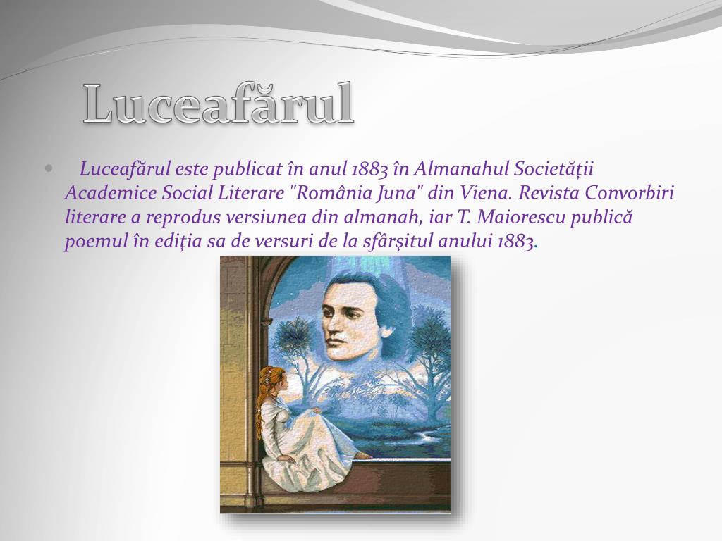 Luceafărul • Luceafărul este publicat în anul 1883 în Almanahul Societății Academice Social Literare "România Juna" din Viena. Revista Convorbiri literare a reprodus versiunea din almanah, iar T. Maiorescu publică poemul în ediţia sa de versuri de la sfârşitul anului 1883.
