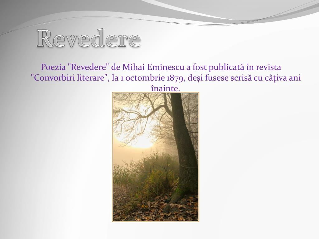 Revedere Poezia "Revedere" de Mihai Eminescu a fost publicată în revista "Convorbiri literare", la 1 octombrie 1879, deşi fusese scrisă cu câţiva ani înainte.
