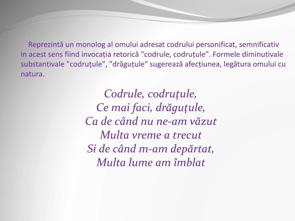 Reprezintă un monolog al omului adresat codrului personificat, semnificativ in acest sens fiind invocația retorică "codrule, codruțule". Formele diminutivale substantivale "codruțule", "drăguțule" sugerează afecțiunea, legătura omului cu natura. Codrule, codruţule, Ce mai faci, drăguţule, Ca de când nu ne-am văzut Multa vreme a trecut Si de când m-am depărtat, Multa lume am îmblat
