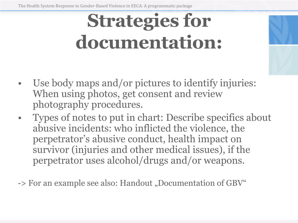 Strategies for documentation: • Use body maps and/or pictures to identify injuries: When using photos, get consent and review photography procedures. • Types of notes to put in chart: Describe specifics about abusive incidents: who inflicted the violence, the perpetrator’s abusive conduct, health impact on survivor (injuries and other medical issues), if the perpetrator uses alcohol/drugs and/or weapons. -> For an example see also: Handout „Documentation of GBV“
