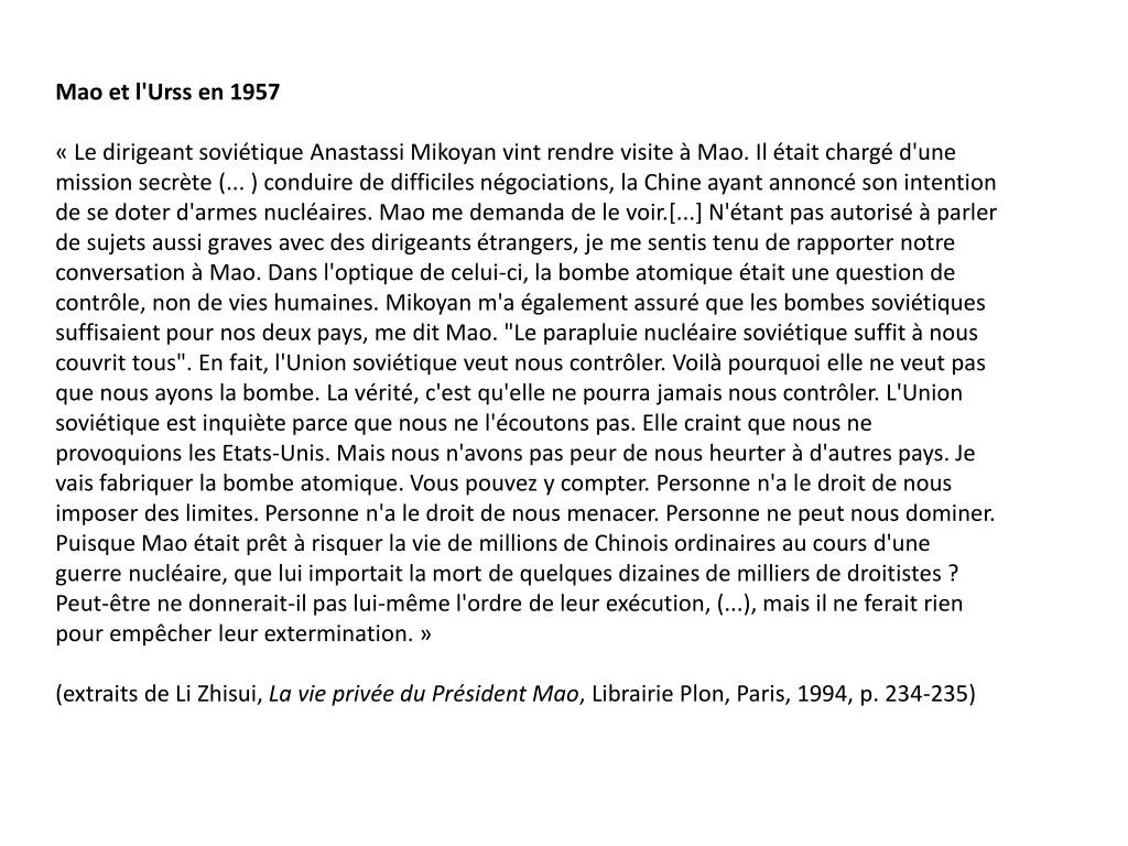 Mao et l'Urss en 1957« Le dirigeant soviétique AnastassiMikoyan vint rendre visite à Mao. Il était chargé d'une mission secrète (... ) conduire de difficiles négociations, la Chine ayant annoncé son intention de se doter d'armes nucléaires. Mao me demanda de le voir.[...] N'étant pas autorisé à parler de sujets aussi graves avec des dirigeants étrangers, je me sentis tenu de rapporter notre conversation à Mao. Dans l'optique de celui-ci, la bombe atomique était une question de contrôle, non de vies humaines. Mikoyan m'a également assuré que les bombes soviétiques suffisaient pour nos deux pays, me dit Mao. "Le parapluie nucléaire soviétique suffit à nous couvrit tous". En fait, l'Union soviétique veut nous contrôler. Voilà pourquoi elle ne veut pas que nous ayons la bombe. La vérité, c'est qu'elle ne pourra jamais nous contrôler. L'Union soviétique est inquiète parce que nous ne l'écoutons pas. Elle craint que nous ne provoquions les Etats-Unis. Mais nous n'avons pas peur de nous heurter à d'autres pays. Je vais fabriquer la bombe atomique. Vous pouvez y compter. Personne n'a le droit de nous imposer des limites. Personne n'a le droit de nous menacer. Personne ne peut nous dominer. Puisque Mao était prêt à risquer la vie de millions de Chinois ordinaires au cours d'une guerre nucléaire, que lui importait la mort de quelques dizaines de milliers de droitistes ? Peut-être ne donnerait-il pas lui-même l'ordre de leur exécution, (...), mais il ne ferait rien pour empêcher leur extermination. »(extraits de Li Zhisui, La vie privée du Président Mao, Librairie Plon, Paris, 1994, p. 234-235)