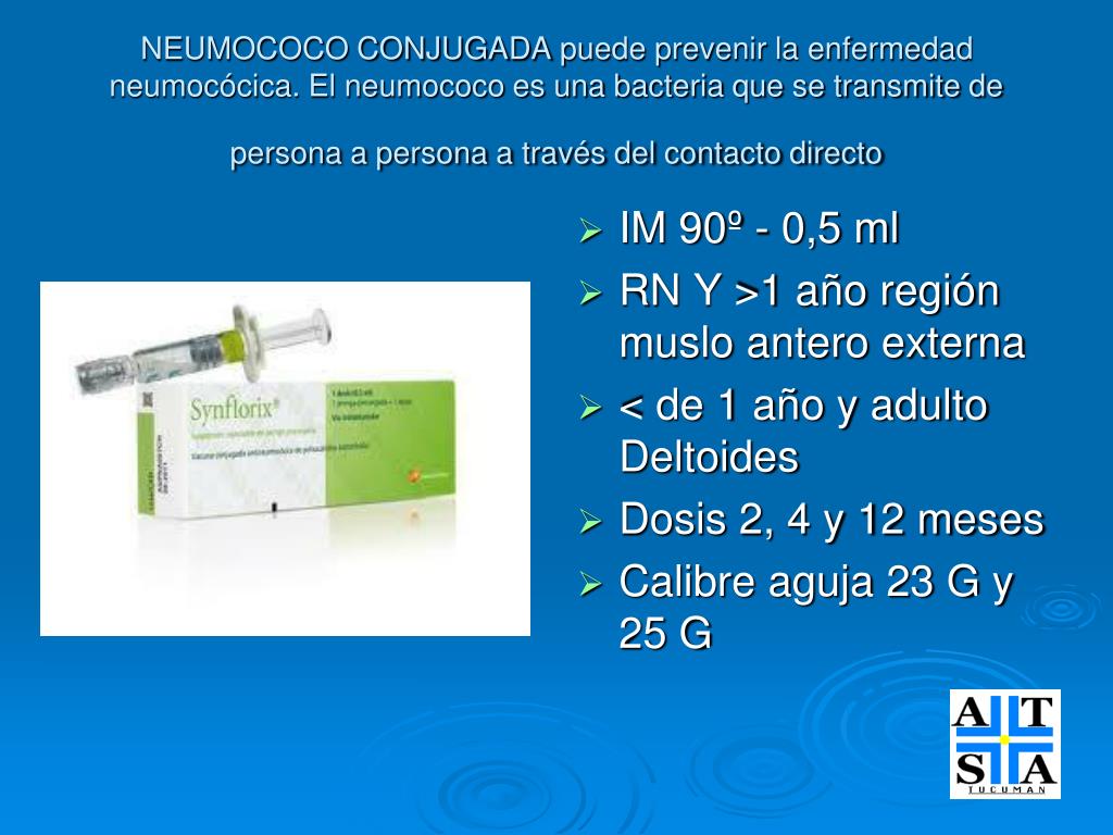 NEUMOCOCO CONJUGADA puede prevenir la enfermedad neumocócica. El neumococo es una bacteria que se transmite de persona a persona a través del contacto directo • IM 90º - 0,5 ml • RN Y >1 año región muslo antero externa • < de 1 año y adulto Deltoides • Dosis 2, 4 y 12 meses • Calibre aguja 23 G y 25 G
