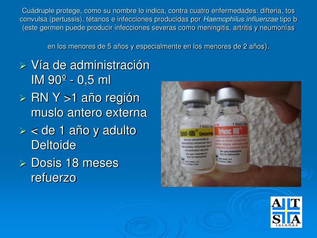 Cuádruple protege, como su nombre lo indica, contra cuatro enfermedades: difteria, tos convulsa (pertussis), tétanos e infecciones producidas por Haemophilus influenzae tipo b (este germen puede producir infecciones severas como meningitis, artritis y neumonías en los menores de 5 años y especialmente en los menores de 2 años). • Vía de administración IM 90º - 0,5 ml • RN Y >1 año región muslo antero externa • < de 1 año y adulto Deltoide • Dosis 18 meses refuerzo