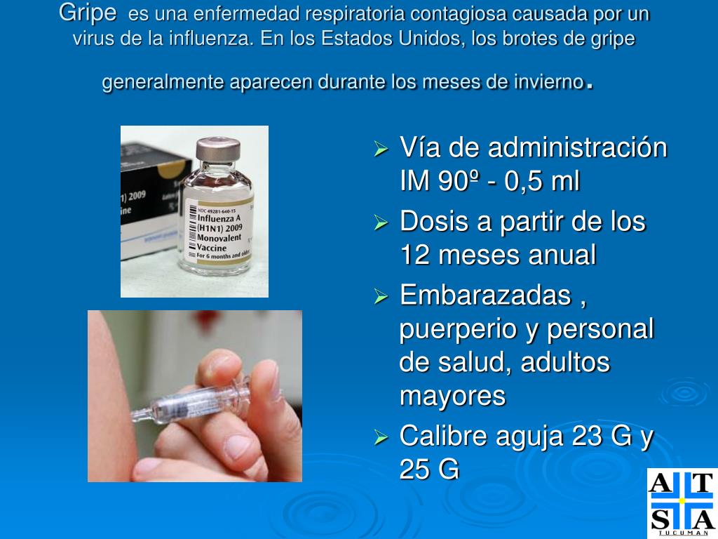 Gripe es una enfermedad respiratoria contagiosa causada por un virus de la influenza. En los Estados Unidos, los brotes de gripe generalmente aparecen durante los meses de invierno. • Vía de administración IM 90º - 0,5 ml • Dosis a partir de los 12 meses anual • Embarazadas , puerperio y personal de salud, adultos mayores • Calibre aguja 23 G y 25 G