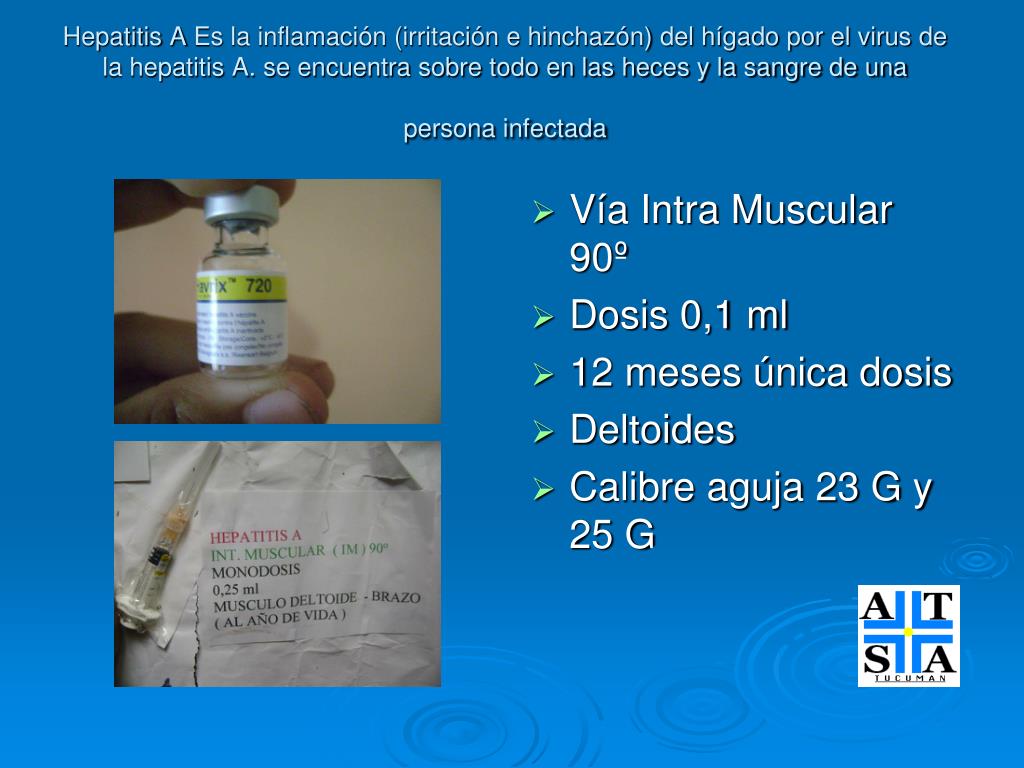 Hepatitis A Es la inflamación (irritación e hinchazón) del hígado por el virus de la hepatitis A. se encuentra sobre todo en las heces y la sangre de una persona infectada • Vía Intra Muscular 90º • Dosis 0,1 ml • 12 meses única dosis • Deltoides • Calibre aguja 23 G y 25 G