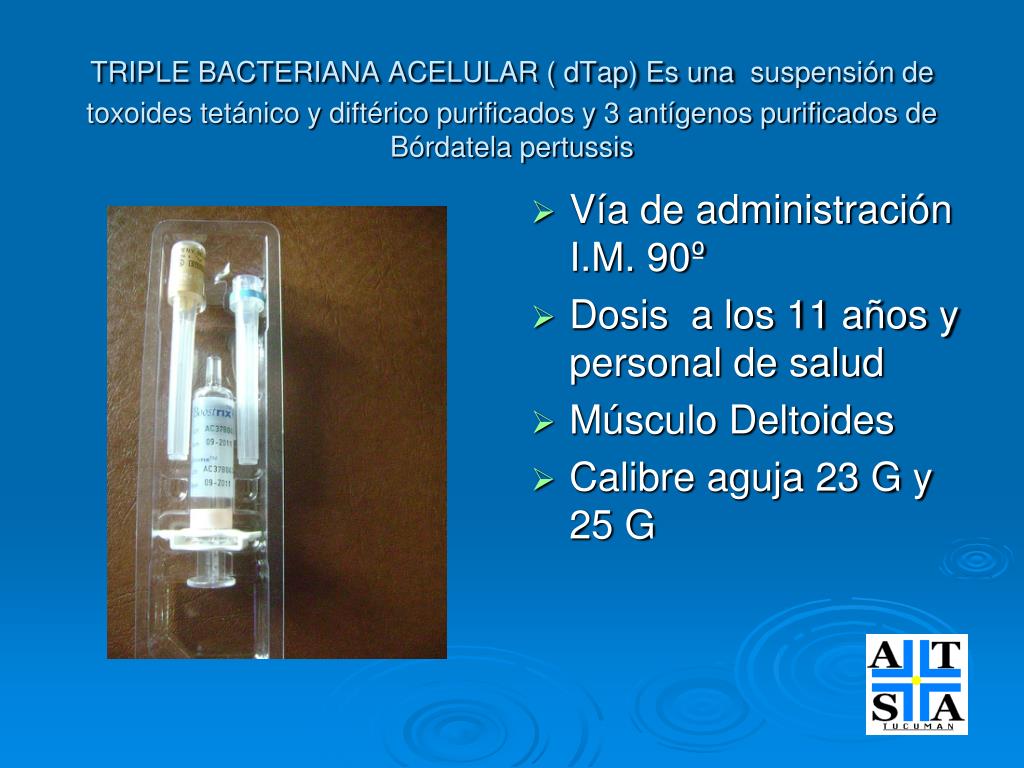 TRIPLE BACTERIANA ACELULAR ( dTap) Es unasuspensión de toxoides tetánico y diftérico purificados y 3 antígenos purificados de Bórdatela pertussis • Vía de administración I.M. 90º • Dosis a los 11 años y personal de salud • Músculo Deltoides • Calibre aguja 23 G y 25 G