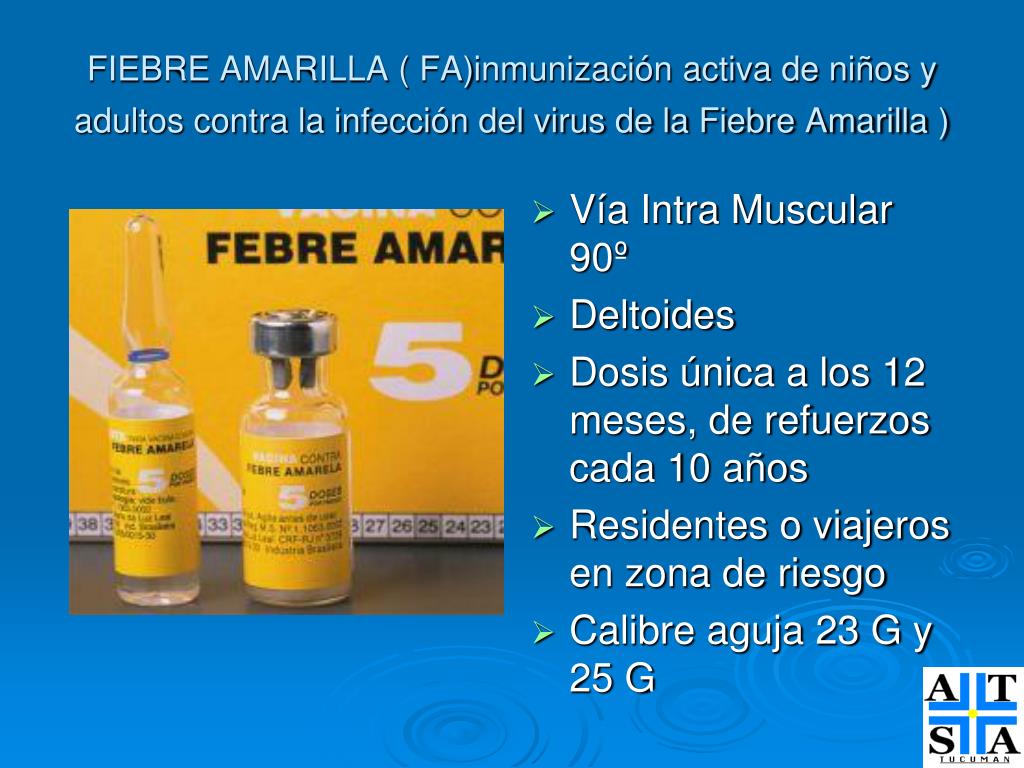 FIEBRE AMARILLA ( FA)inmunización activa de niños y adultos contra la infección del virus de la Fiebre Amarilla ) • Vía Intra Muscular 90º • Deltoides • Dosis única a los 12 meses, de refuerzos cada 10 años • Residentes o viajeros en zona de riesgo • Calibre aguja 23 G y 25 G