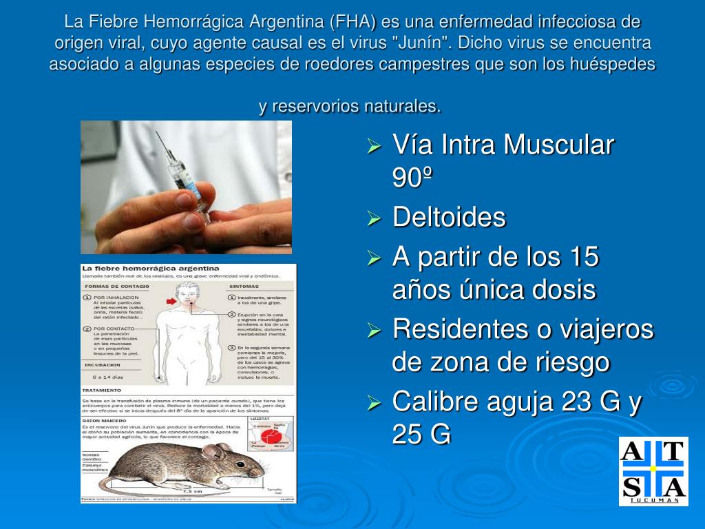 La Fiebre Hemorrágica Argentina (FHA) es una enfermedad infecciosa de origen viral, cuyo agente causal es el virus "Junín". Dicho virus se encuentra asociado a algunas especies de roedores campestres que son los huéspedes y reservorios naturales. • Vía Intra Muscular 90º • Deltoides • A partir de los 15 años única dosis • Residentes o viajeros de zona de riesgo • Calibre aguja 23 G y 25 G