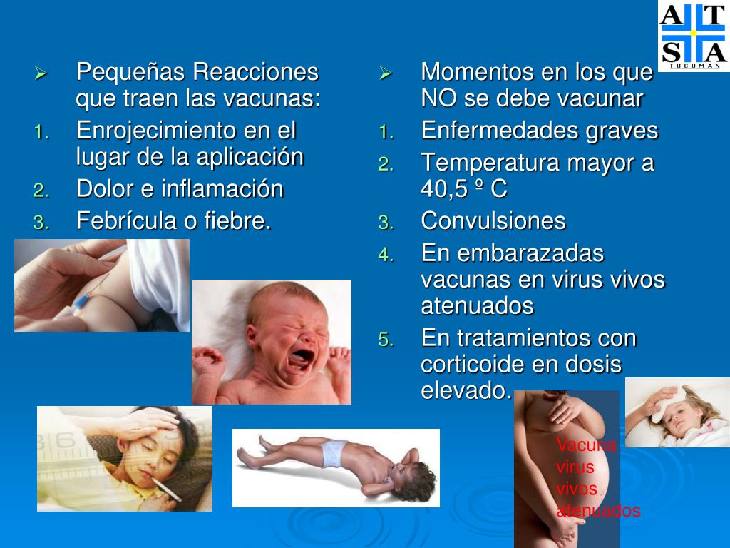 Pequeñas Reacciones que traen las vacunas: Enrojecimiento en el lugar de la aplicación Dolor e inflamación Febrícula o fiebre. Momentos en los que NO se debe vacunar Enfermedades graves Temperatura mayor a 40,5 º C Convulsiones En embarazadas vacunas en virus vivos atenuados En tratamientos con corticoide en dosis elevado. Vacuna virus vivos atenuados
