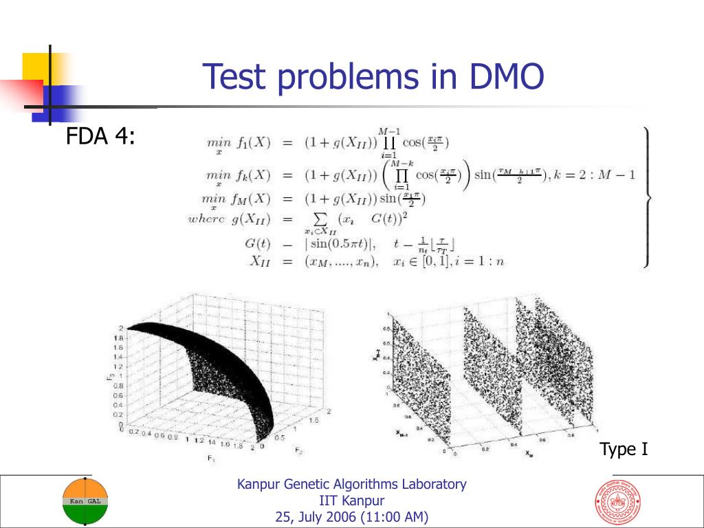 Test problems in DMO • The following test problems are formulated by Farina et. al. (2004). FDA 1 : Constant convex Pareto-optimal front in objective space and linear change in solution space. FDA 2 : Pareto-optimal front changes from convex to non convex and no change in solution space. FDA 3 : Change in Pareto-optimal front but all convex and linear change in solution space. FDA 4 : Constant non convex Pareto-optimal front and linear change in solution space which is three Dimensional space. FDA 5 : Change in Pareto-optimal front but all non convex and linear change in solution space which is three dimensional space. Kanpur Genetic Algorithms Laboratory IIT Kanpur 25, July 2006 (11:00 AM)