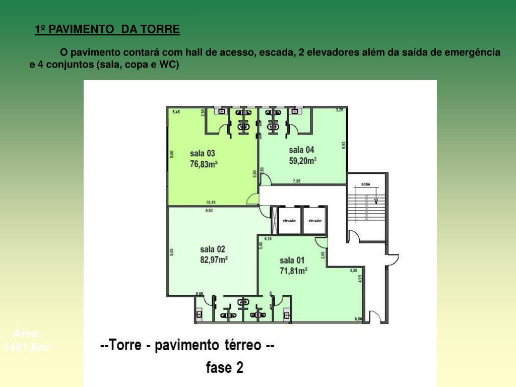 1º PAVIMENTO DA TORRE O pavimento contará com hall de acesso, escada, 2 elevadores além da saída de emergência e 4 conjuntos (sala, copa e WC) Área: 1491,6m²