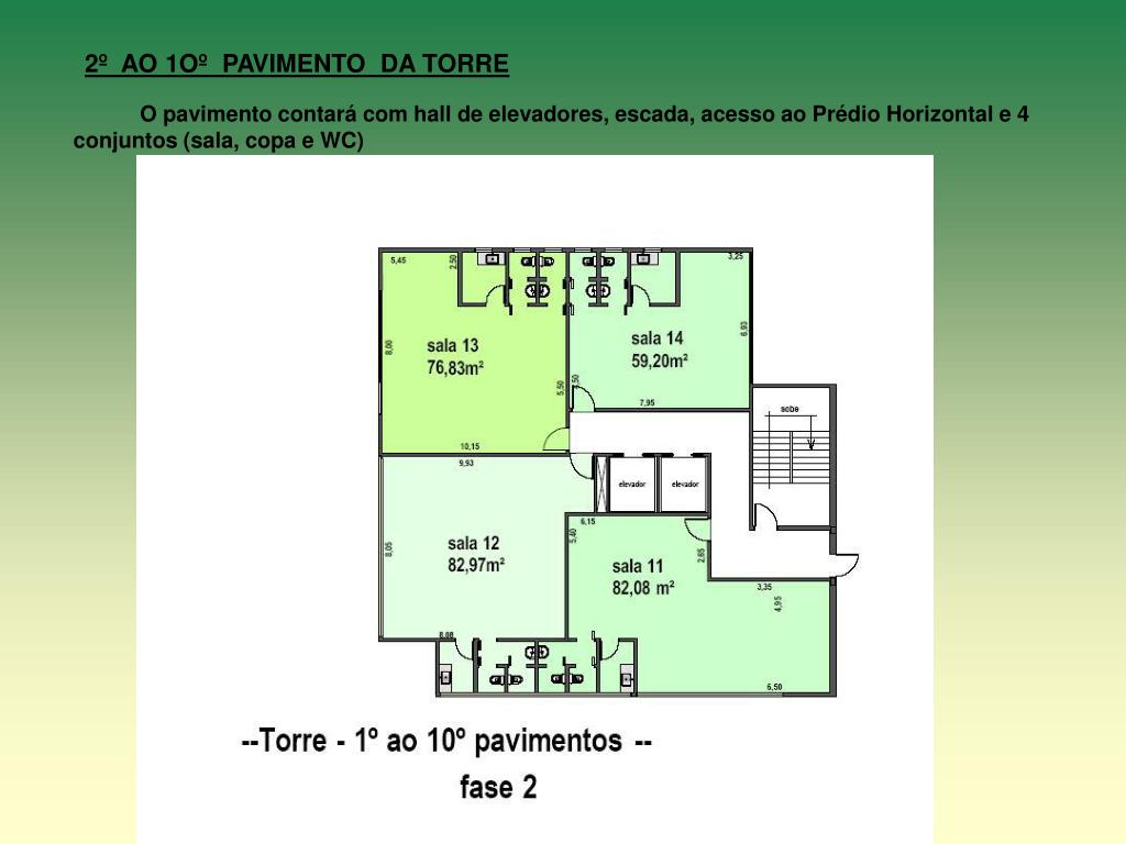 Pré-lançamento – Julho/2010 • Será construído em 2 fases: • 1ª fase - Prédio Horizontal: • - 5 pavimentos compostos por Subsolo, Térreo , 1o. ao 3o. andar com conjuntos (sala, copa e WC) de diferentes tamanhos • - 2 elevadores panorâmicos + 1 elevador grande (tamanho especial para maca) • - Previsão de entrega: 12meses • 2ª fase - Torre • - 11 pavimentos compostos por Subsolo, Térreo e 10 andares de 4 conjuntos (sala, copa e WC) por andar • - Previsão de Entrega: 30 meses • - 2 elevadores