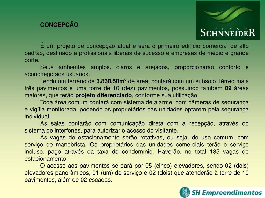 CONCEPÇÃO É um projeto de concepção atual e será o primeiro edifício comercial de alto padrão, destinado a profissionais liberais de sucesso e empresas de médio e grande porte. Seus ambientes amplos, claros e arejados, proporcionarão conforto e aconchego aos usuários. Tendo um terreno de 3.830,50m² de área, contará com um subsolo, térreo mais três pavimentos e uma torre de 10 (dez) pavimentos, possuindo também 09 áreas maiores, que terão projeto diferenciado, conforme sua utilização. Toda área comum contará com sistema de alarme, com câmeras de segurança e vigília monitorada, podendo os proprietários das unidades optarem pela segurança individual. As salas contarão com comunicação direta com a recepção, através do sistema de interfones, para autorizar o acesso do visitante. As vagas de estacionamento serão rotativas, ou seja, de uso comum, com serviço de manobrista. Os proprietários das unidades comerciais terão o serviço incluso, pago através da taxa de condomínio. Haverão, no total 135 vagas de estacionamento. O acesso aos pavimentos se dará por 05 (cinco) elevadores, sendo 02 (dois) elevadores panorâmicos, 01 (um) de serviço e 02 (dois) que atenderão à torre de 10 pavimentos, além de 02 escadas.