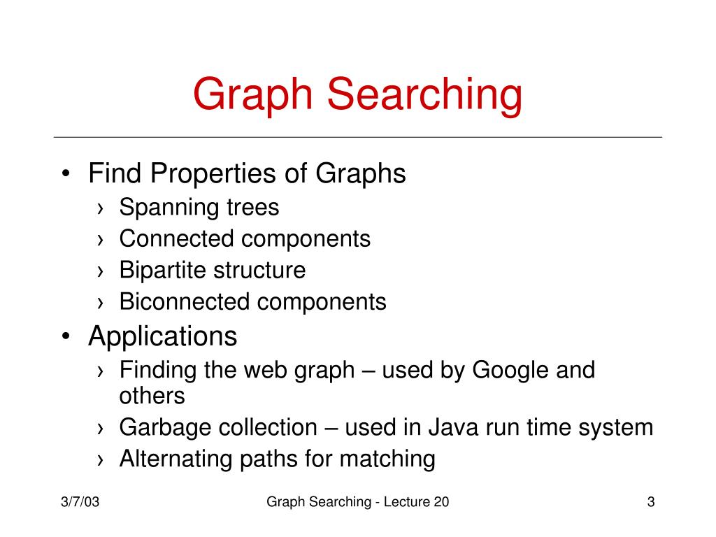 Graph Searching • Find Properties of Graphs • Spanning trees • Connected components • Bipartite structure • Biconnected components • Applications • Finding the web graph – used by Google and others • Garbage collection – used in Java run time system • Alternating paths for matching Graph Searching - Lecture 20